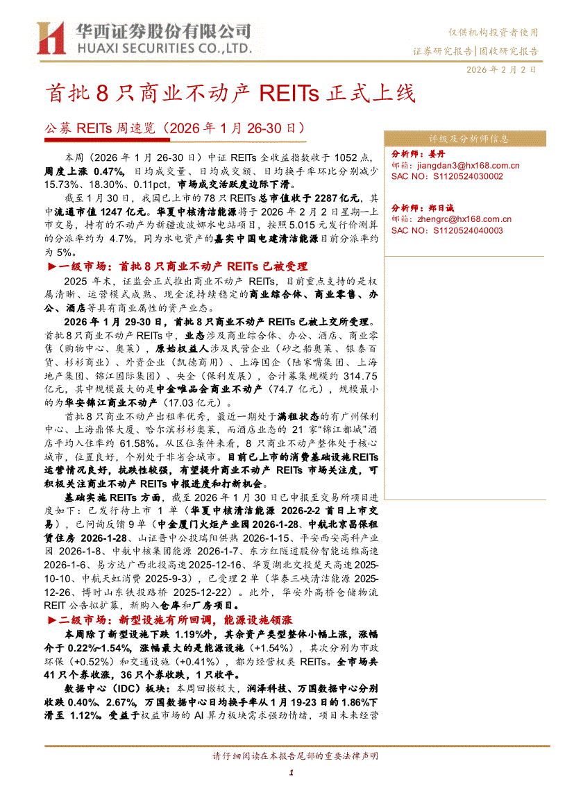 华西证券-公募REITs周速览(2026年1月26~30日):首批8只商业不动产REITs正式上线-260202
