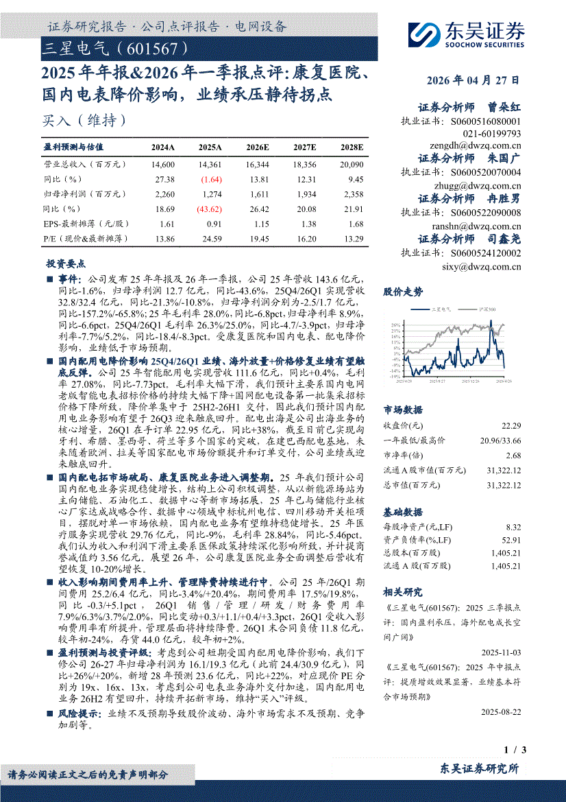 三星电气:东吴证券-三星电气-601567-2025年年报&2026年一季报点评:康复医院、国内电表降价影响,业绩承压静待拐点-260427