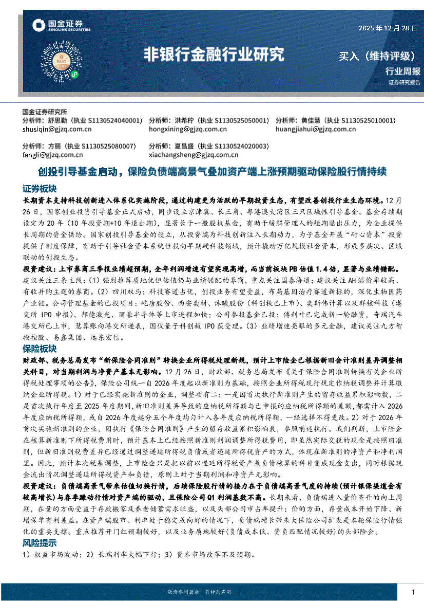 非银行金融行业:国金证券-非银行金融行业周报:创投引导基金启动,保险负债端高景气叠加资产端上涨预期驱动保险股行情持续-251228