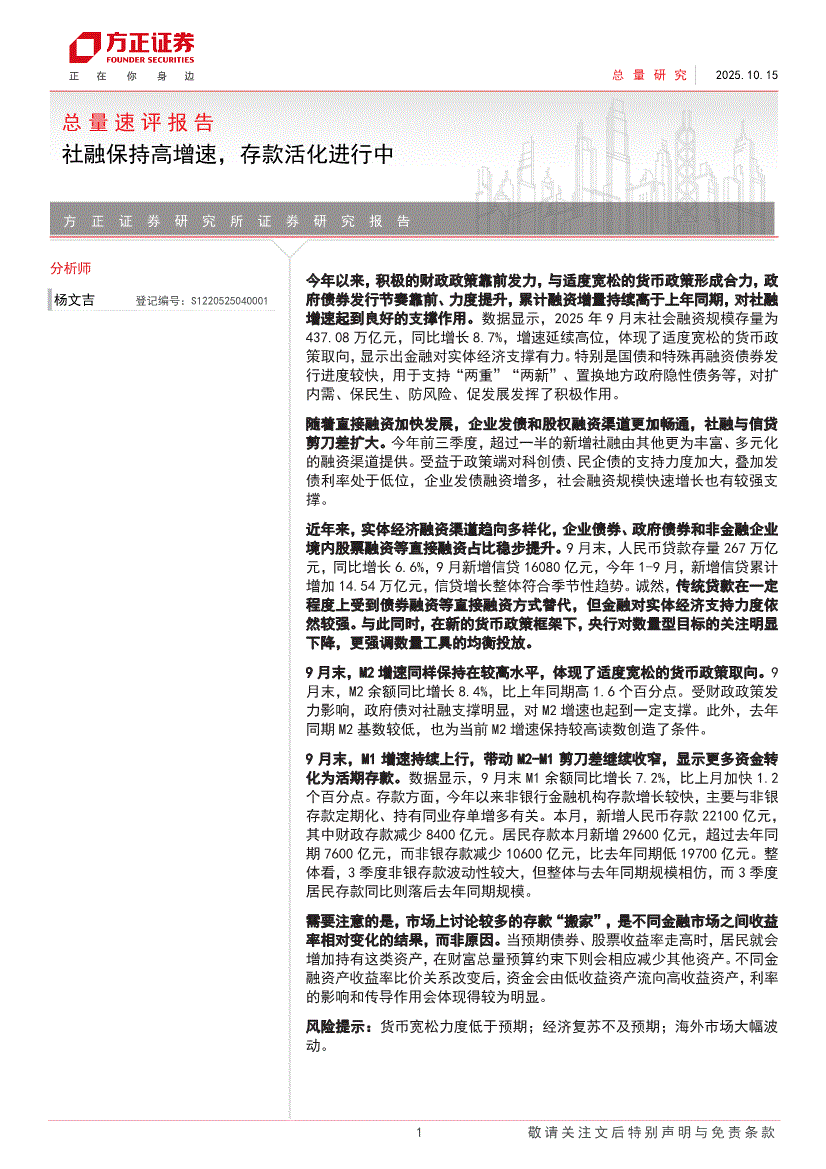 方正证券-总量速评报告:社融保持高增速,存款活化进行中-251015