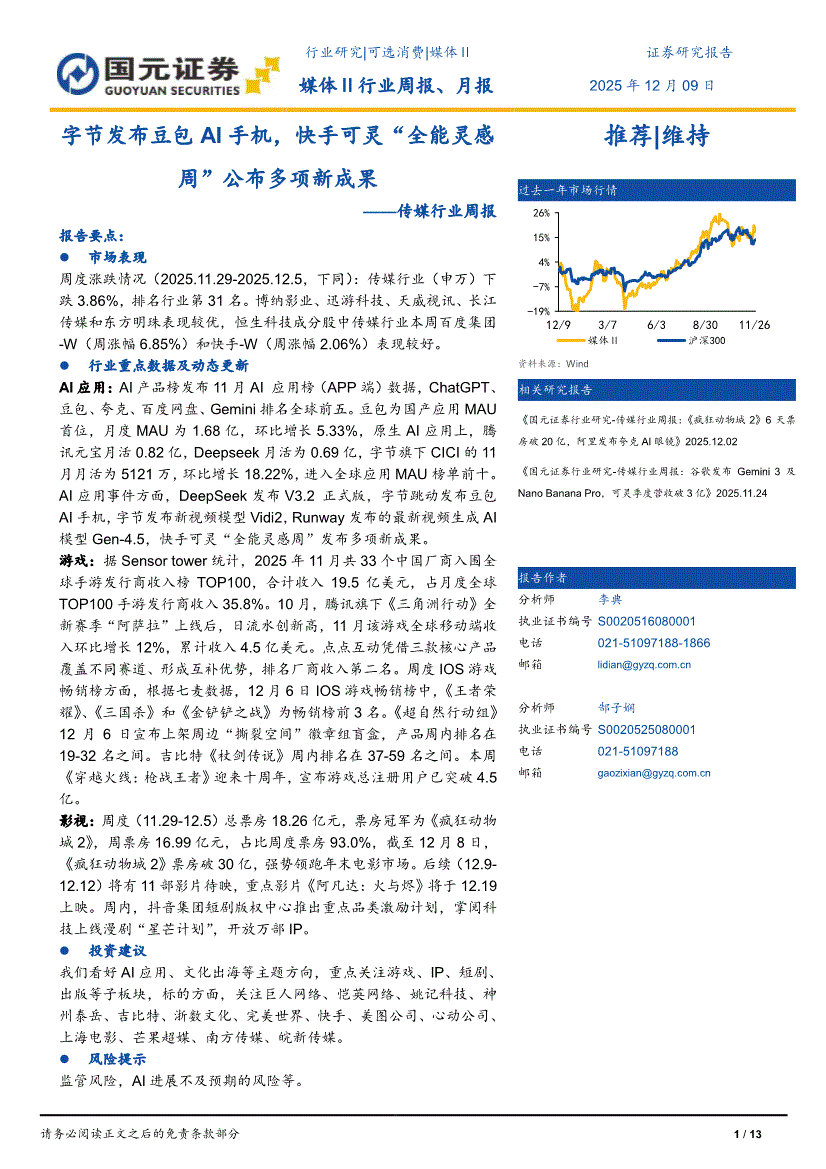 传媒行业:国元证券-传媒行业周报:字节发布豆包AI手机,快手可灵“全能灵感周”公布多项新成果-251209