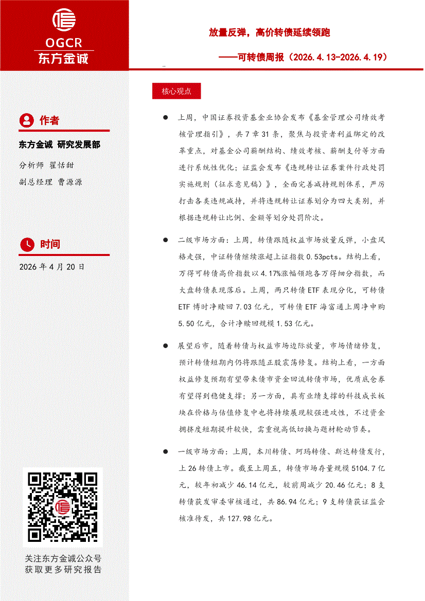 东方金诚-可转债周报:放量反弹,高价转债延续领跑-260420