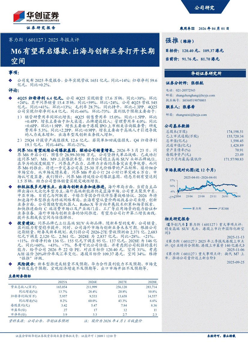 赛力斯:华创证券-赛力斯-601127-2025年报点评:M6有望再启爆款,出海与创新业务打开长期空间-260401
