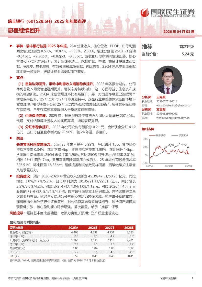 瑞丰银行:国联民生证券-瑞丰银行-601528-2025年年报点评:息差继续回升-260403