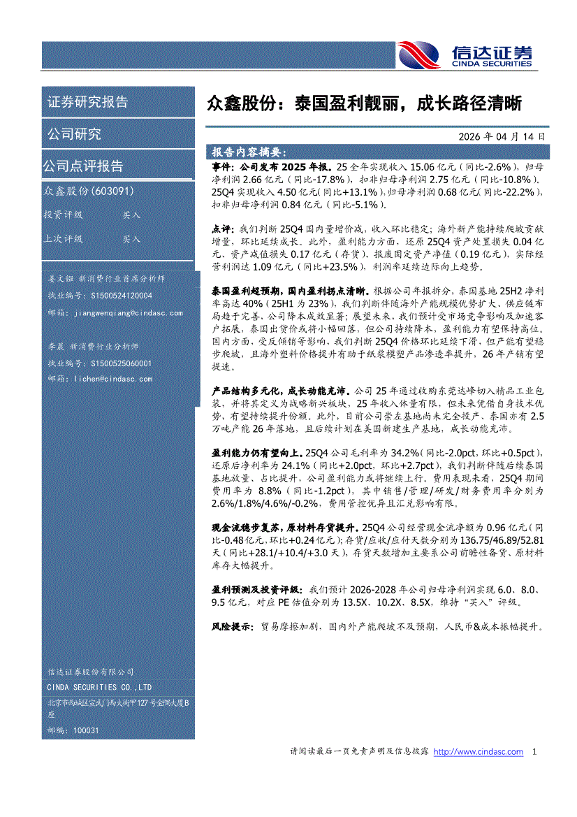 众鑫股份:信达证券-众鑫股份-603091-泰国盈利靓丽,成长路径清晰-260414