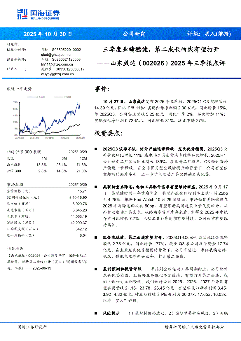 山东威达:国海证券-山东威达-002026-2025年三季报点评:三季度业绩稳健,第二成长曲线有望打开-251030