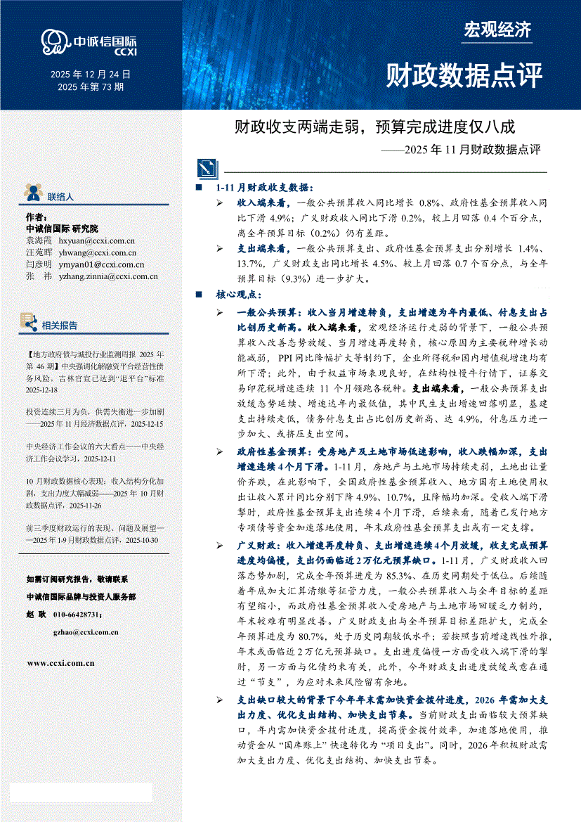 中诚信国际-2025年11月财政数据点评:财政收支两端走弱,预算完成进度仅八成-251224