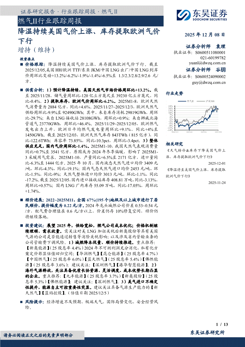 燃气行业:东吴证券-燃气Ⅱ行业跟踪周报:降温持续美国气价上涨、库存提取欧洲气价下行-251208