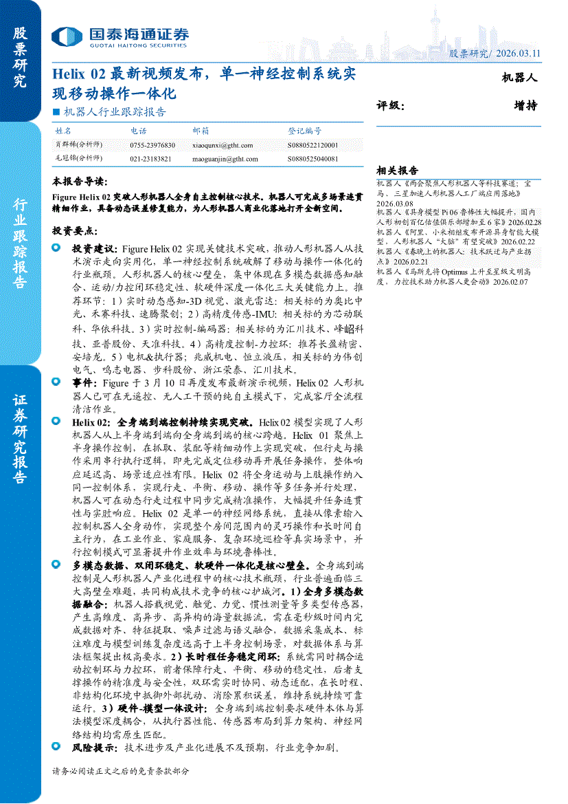 机器人行业:国泰海通证券-机器人行业跟踪报告:Helix 02最新视频发布,单一神经控制系统实现移动操作一体化-260311