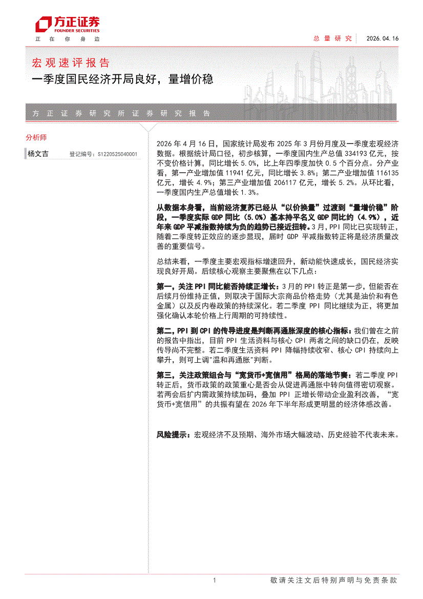 方正证券-宏观速评报告:一季度国民经济开局良好,量增价稳-260416