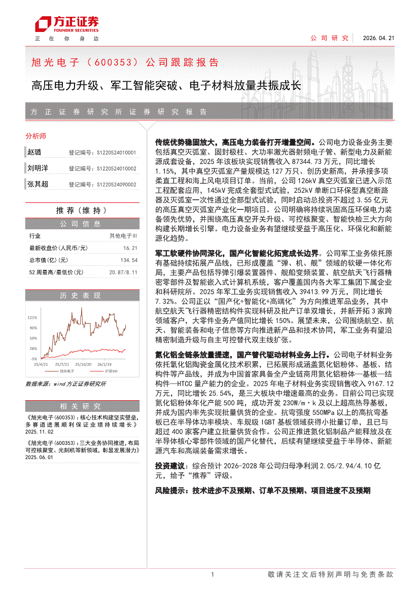 旭光电子:方正证券-旭光电子-600353-公司跟踪报告:高压电力升级、军工智能突破、电子材料放量共振成长-260421