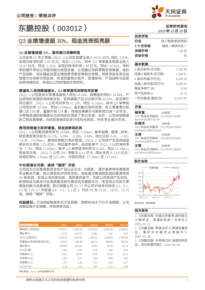 东鹏控股:天风证券-东鹏控股-003012-Q3业绩增速超30%,现金流表现亮眼-251029