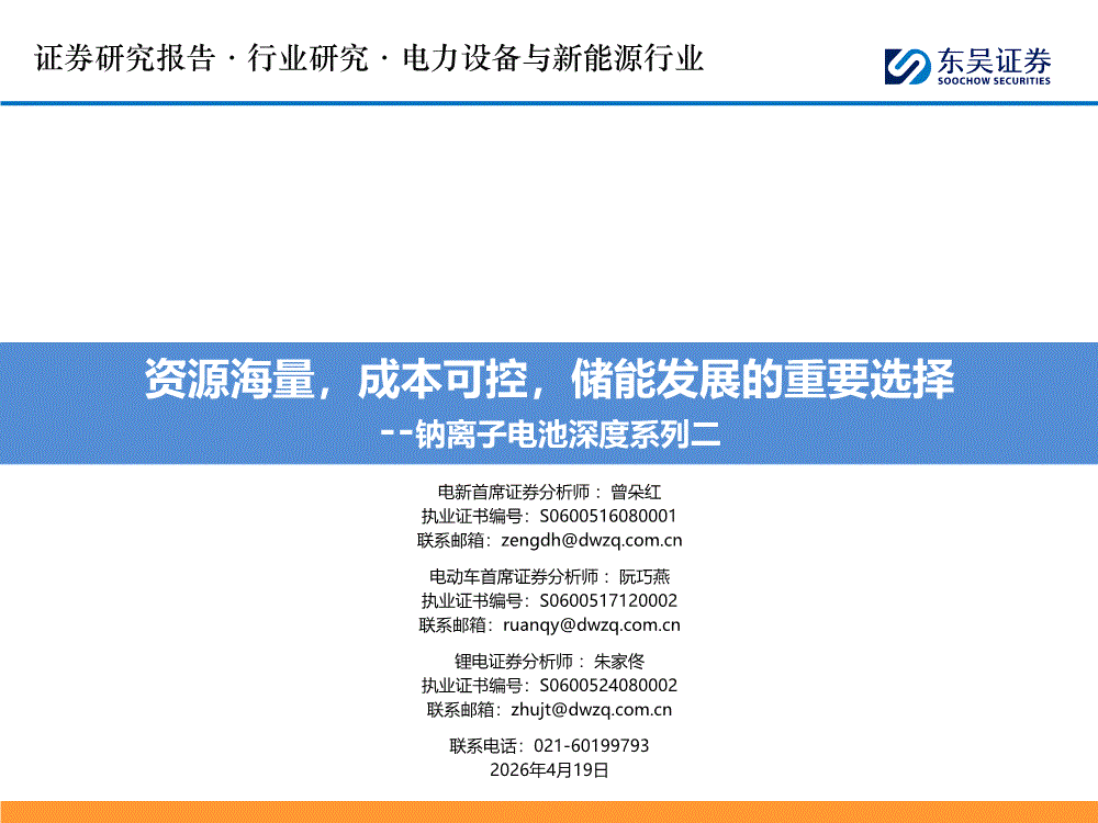 电力设备与新能源行业:东吴证券-电力设备与新能源行业钠离子电池深度系列二:资源海量,成本可控,储能发展的重要选择-260419