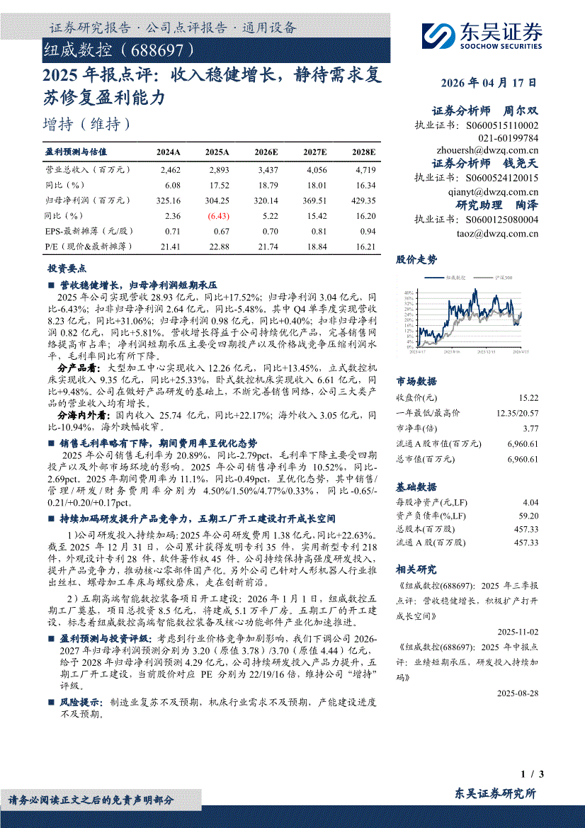 纽威数控:东吴证券-纽威数控-688697-2025年报点评:收入稳健增长,静待需求复苏修复盈利能力-260417