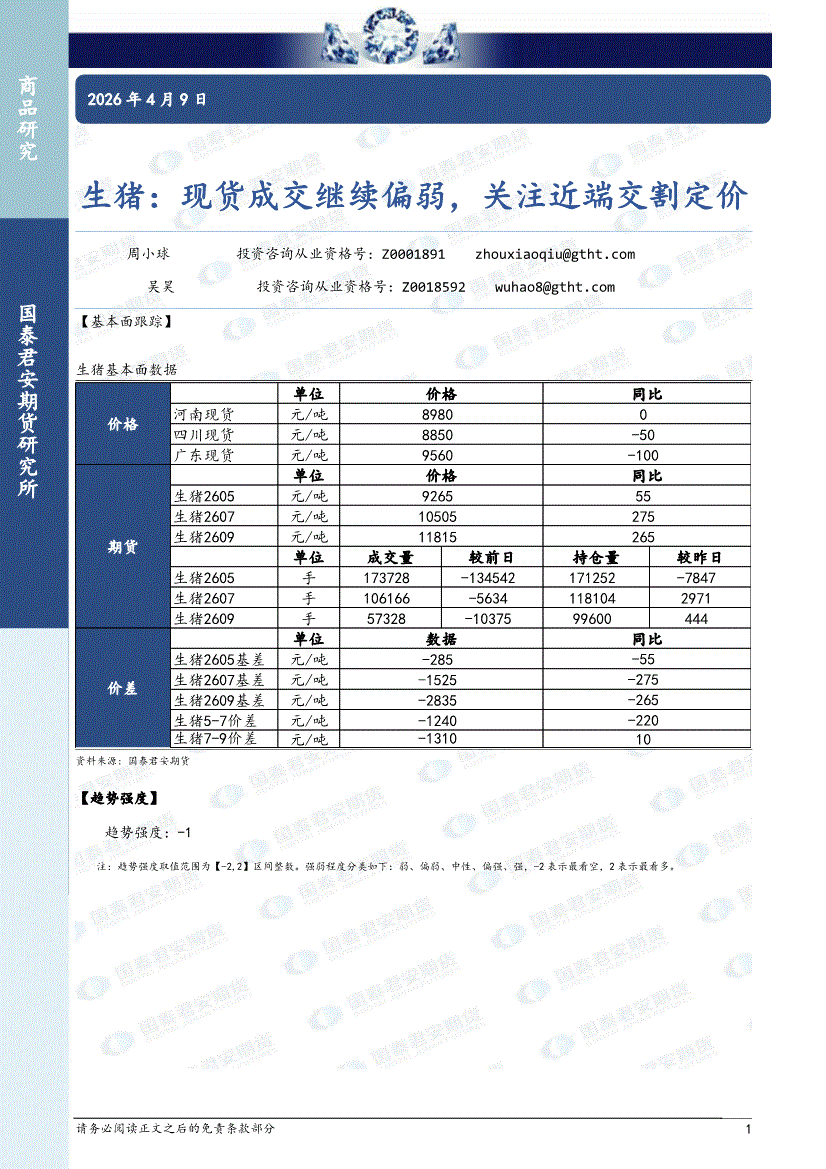 国泰君安期货-生猪:现货成交继续偏弱,关注近端交割定价-260409