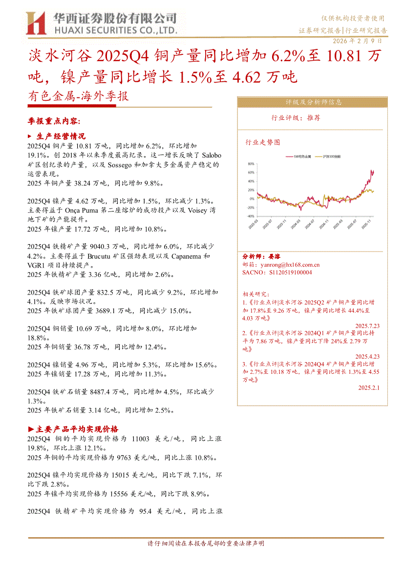 有色金属行业:华西证券-有色金属行业~海外季报:淡水河谷2025Q4铜产量同比增加6.2%至10.81万吨,镍产量同比增长1.5%至4.62万吨-260209