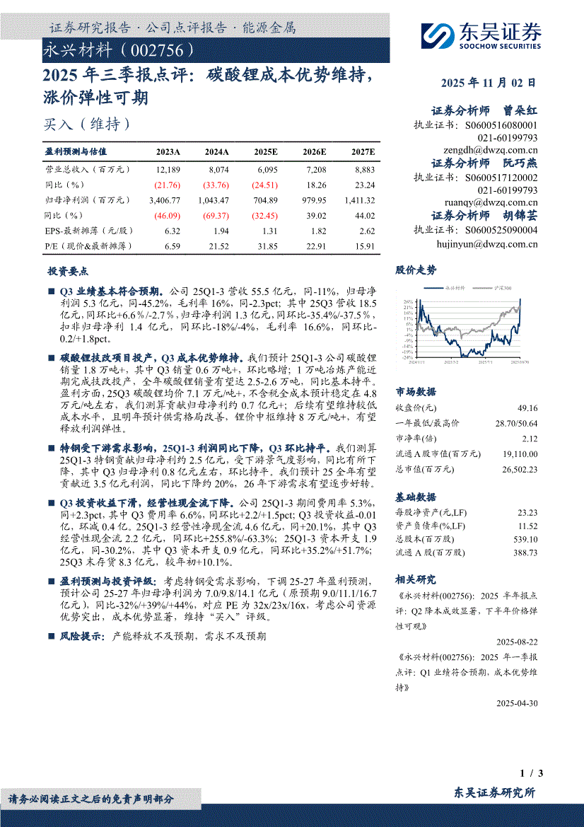 永兴材料:东吴证券-永兴材料-002756-2025年三季报点评:碳酸锂成本优势维持,涨价弹性可期-251102