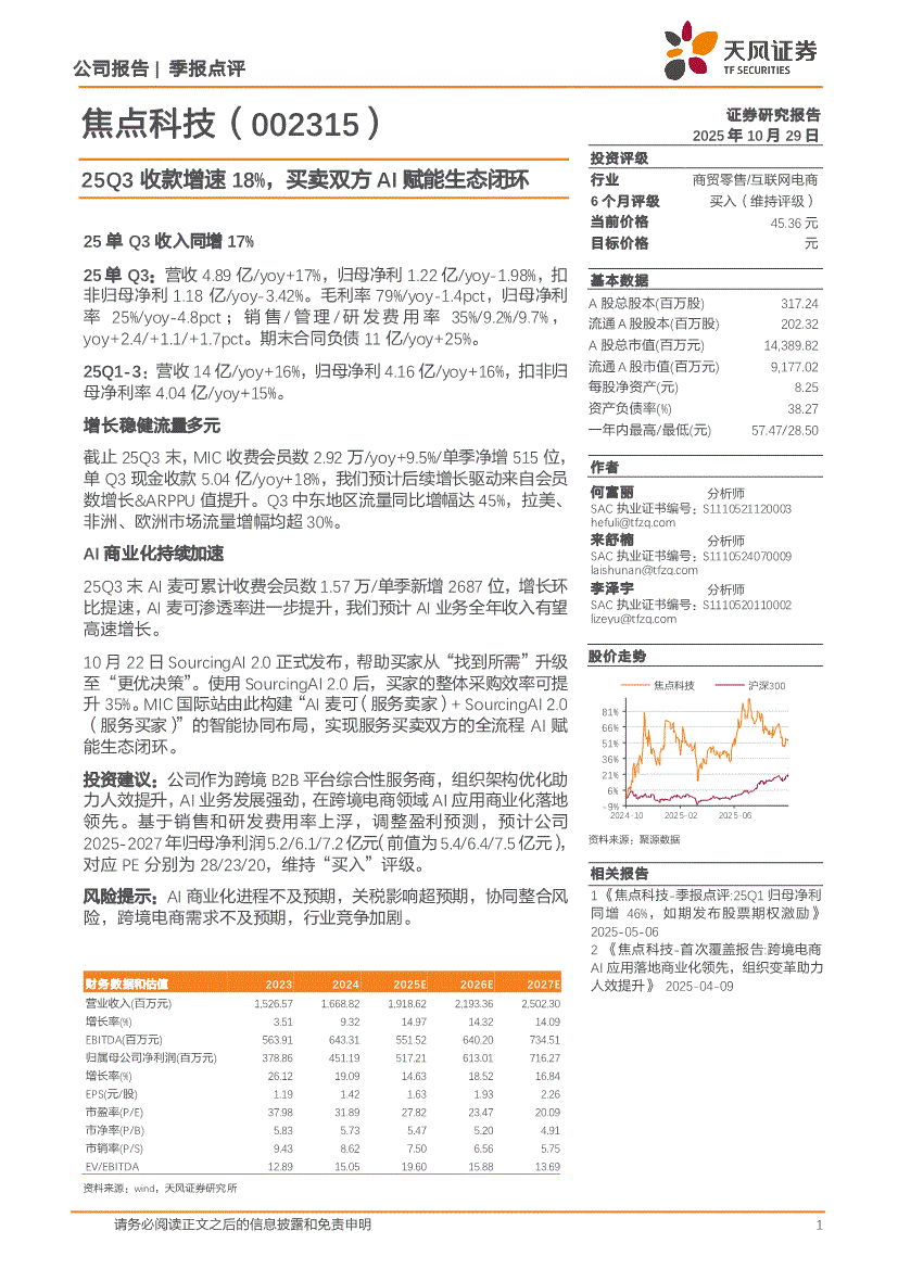 焦点科技:天风证券-焦点科技-002315-25Q3收款增速18%,买卖双方AI赋能生态闭环-251029