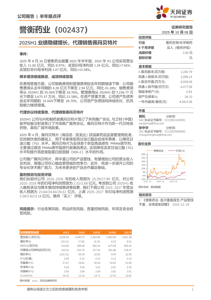 誉衡药业:天风证券-誉衡药业-002437-2025H1业绩稳健增长,代理销售佩玛贝特片-251008