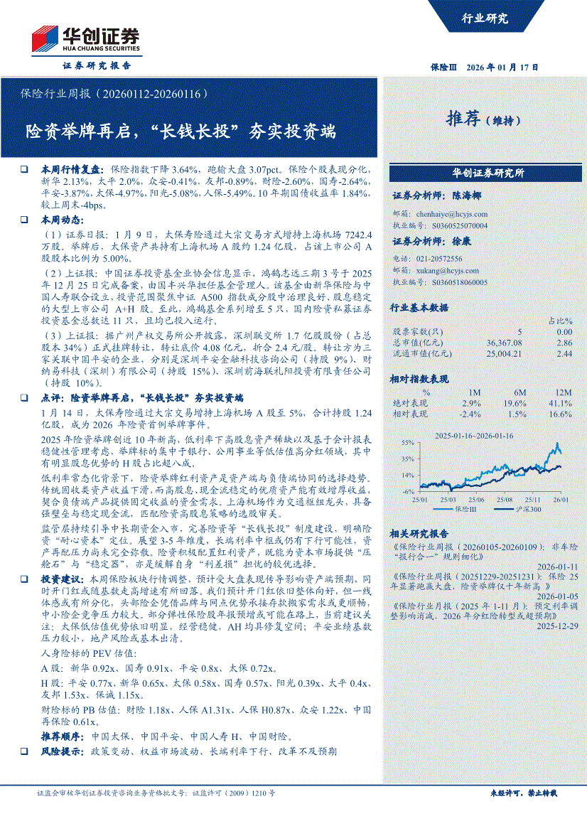 保险行业:华创证券-保险行业周报:险资举牌再启,“长钱长投”夯实投资端-260117