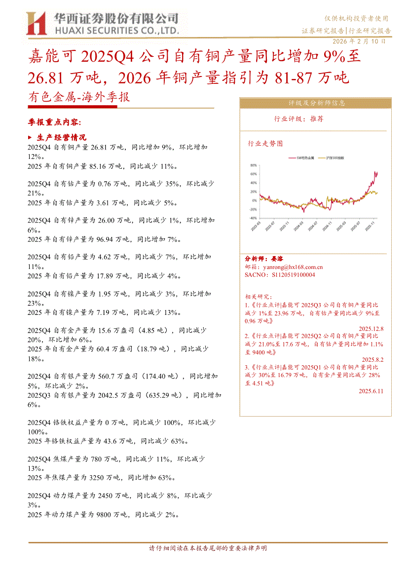 有色金属行业:华西证券-有色金属行业~海外季报:嘉能可2025Q4公司自有铜产量同比增加9%至26.81万吨,2026年铜产量指引为81~87万吨-260210