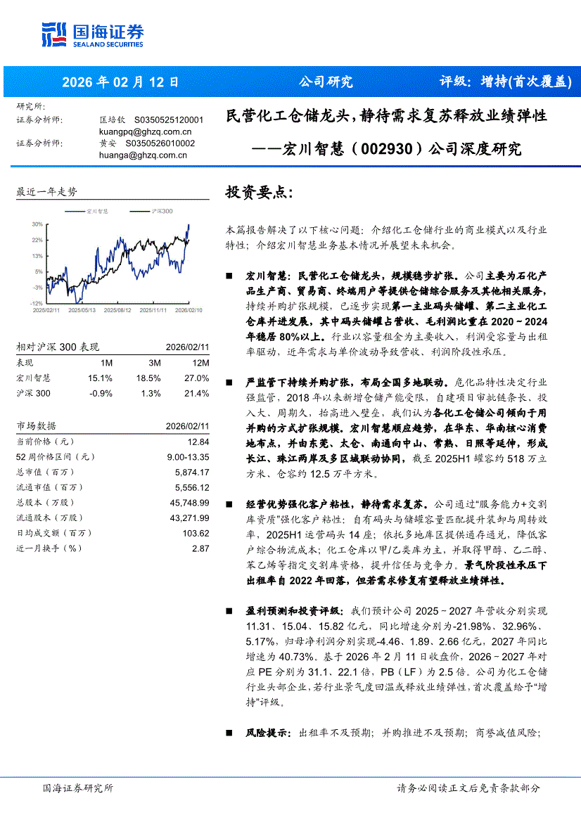 宏川智慧:国海证券-宏川智慧-002930-公司深度研究:民营化工仓储龙头,静待需求复苏释放业绩弹性-260212