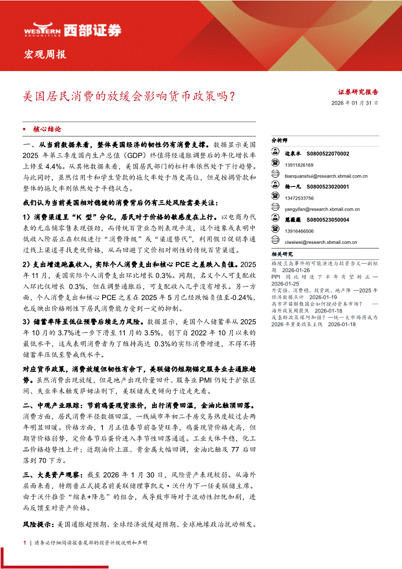 西部证券-宏观周报:美国居民消费的放缓会影响货币政策吗?-260131