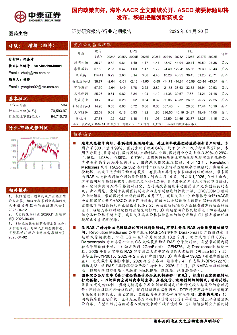 医药生物行业:中泰证券-医药生物行业:国内政策向好,海外AACR全文陆续公开、ASCO摘要标题即将发布,积极把握创新药机会-260420