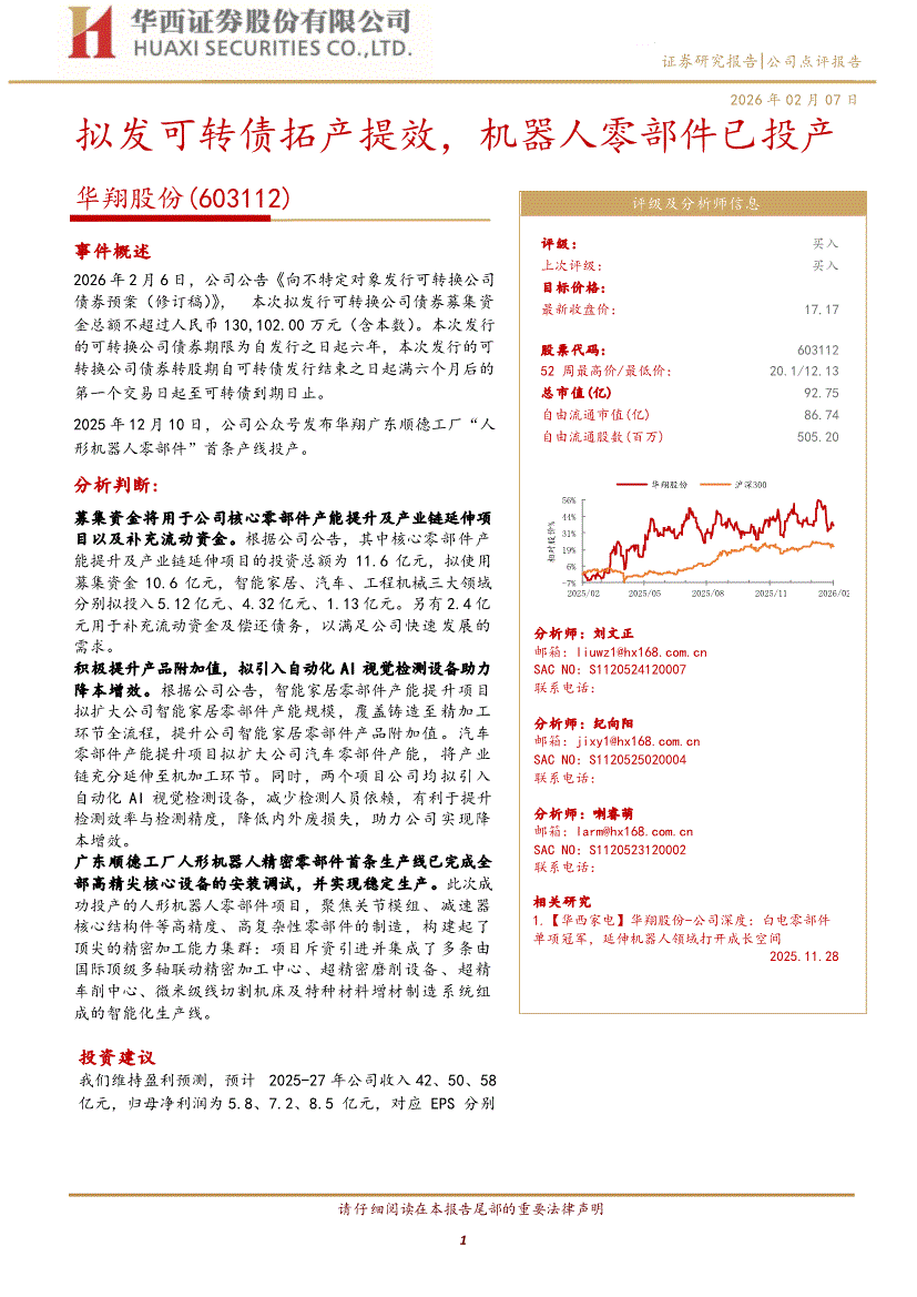 华翔股份:华西证券-华翔股份-603112-拟发可转债拓产提效,机器人零部件已投产-260207