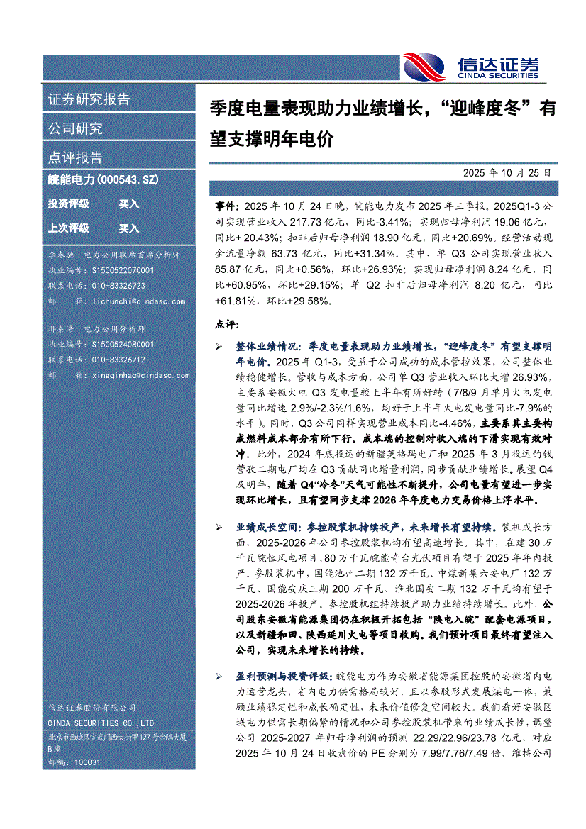 皖能电力:信达证券-皖能电力-000543-季度电量表现助力业绩增长,“迎峰度冬”有望支撑明年电价-251025