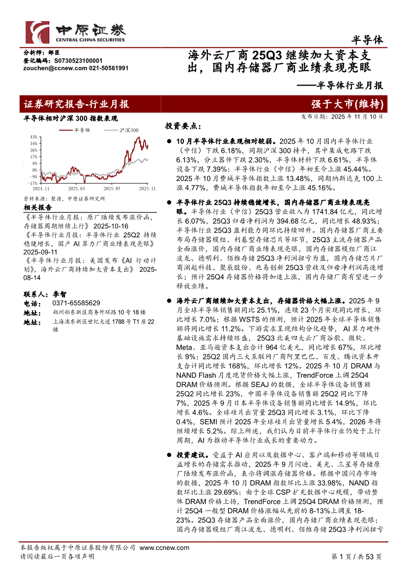 半导体行业:中原证券-半导体行业月报:海外云厂商25Q3继续加大资本支出,国内存储器厂商业绩表现亮眼-251110