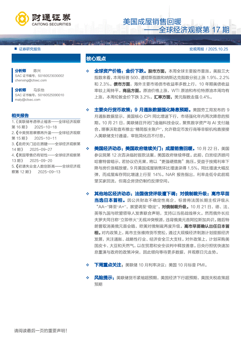 财通证券-全球经济观察第17期:美国成屋销售回暖-251025