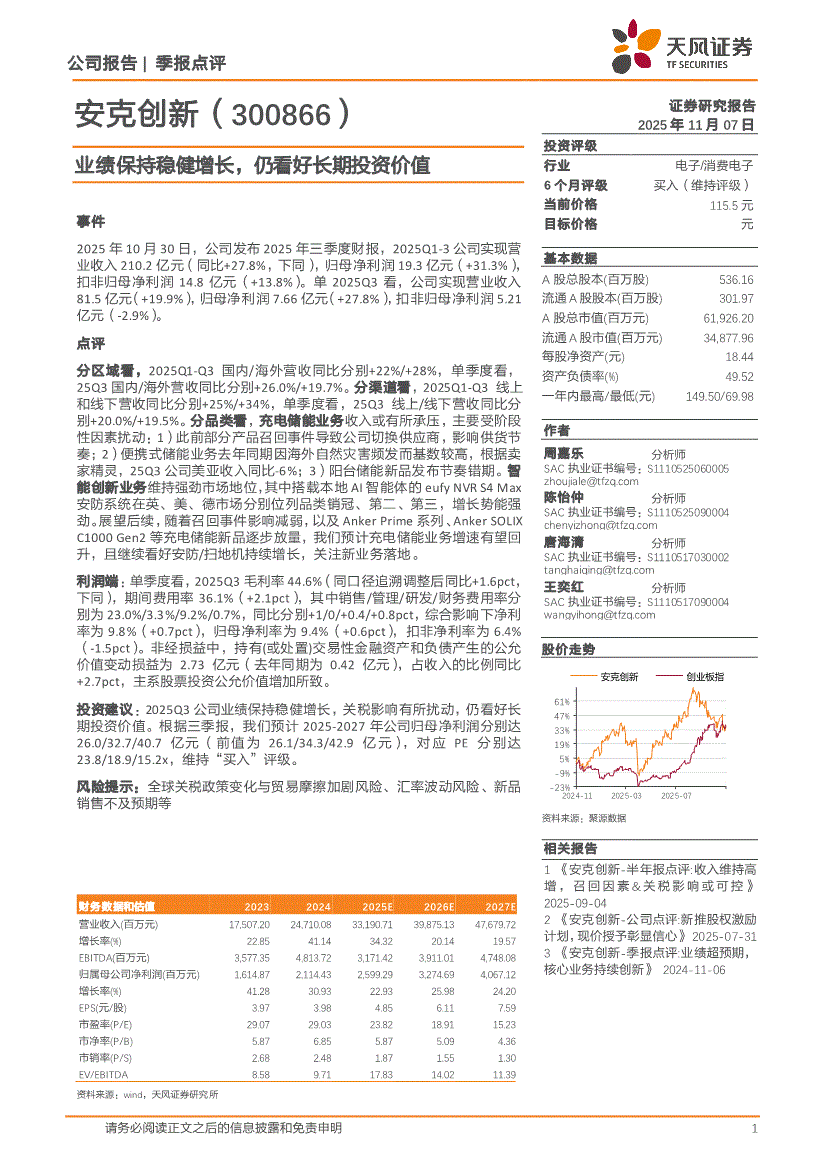 安克创新:天风证券-安克创新-300866-业绩保持稳健增长,仍看好长期投资价值-251107