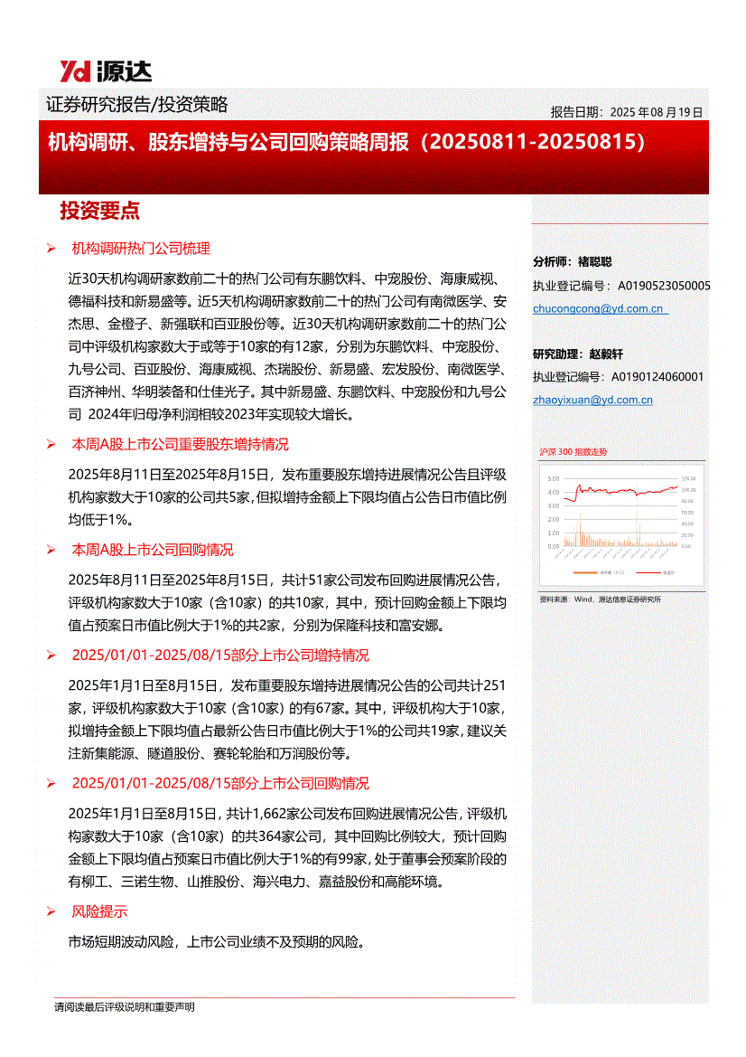 源达信息-机构调研、股东增持与公司回购策略周报-250819