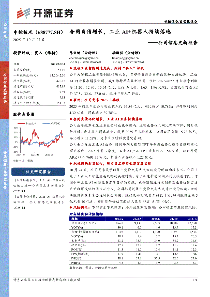 中控技术:开源证券-中控技术-688777-公司信息更新报告:合同负债增长,工业AI+机器人持续落地-251027