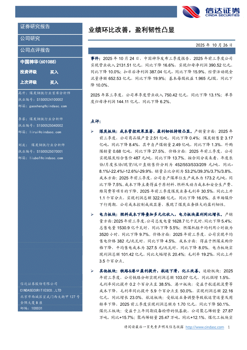 中国神华:信达证券-中国神华-601088-业绩环比改善,盈利韧性凸显-251026