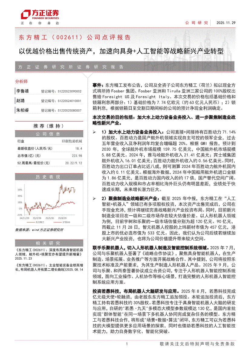 东方精工:方正证券-东方精工-002611-公司点评报告:以优越价格出售传统资产,加速向具身+人工智能等战略新兴产业转型-251129