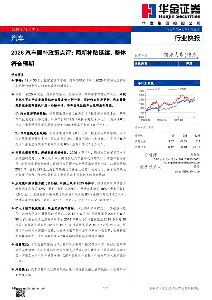 汽车行业:华金证券-汽车行业2026汽车国补政策点评:两新补贴延续,整体符合预期-251231