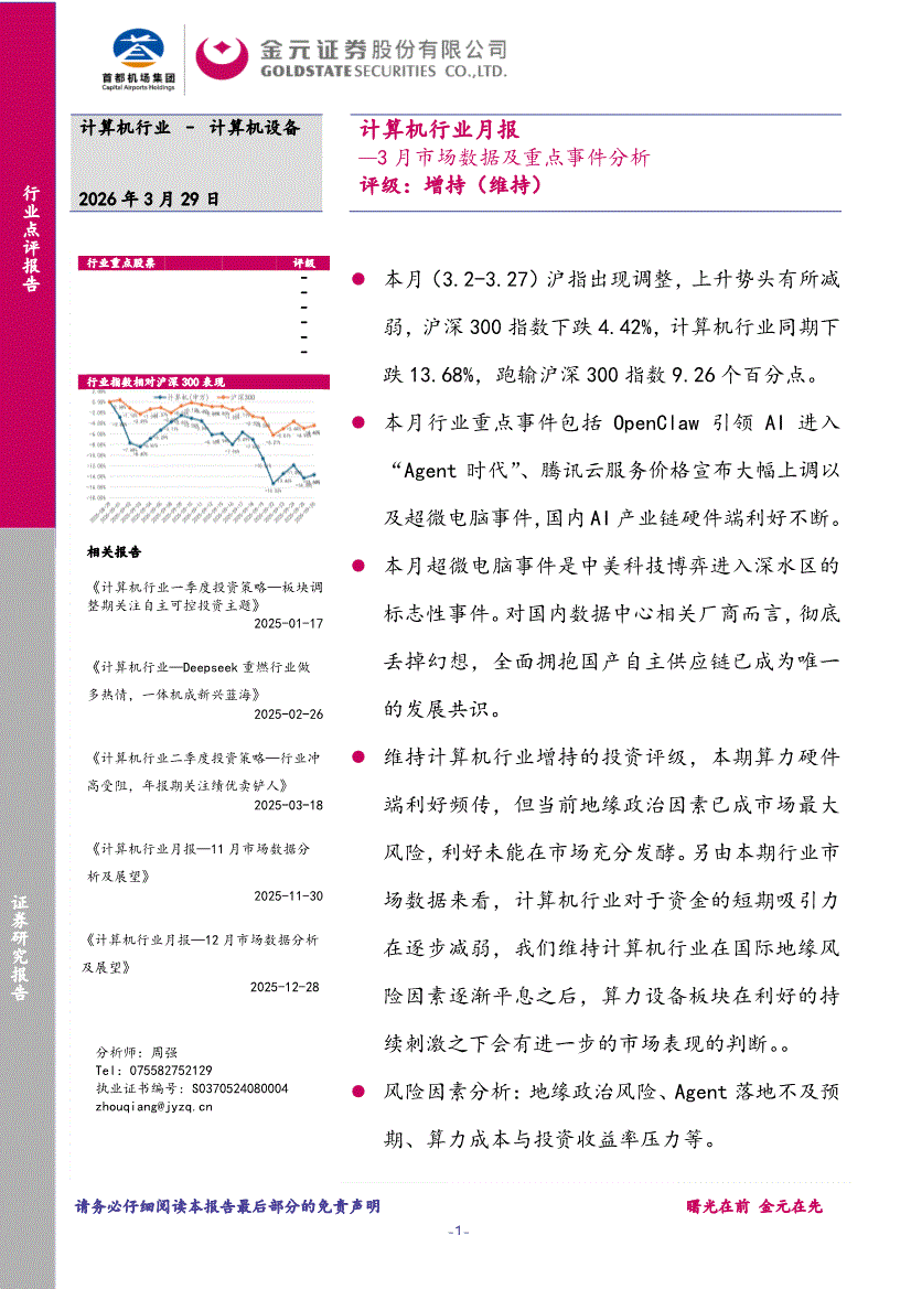 计算机行业:金元证券-计算机行业月报:3月市场数据及重点事件分析-260329