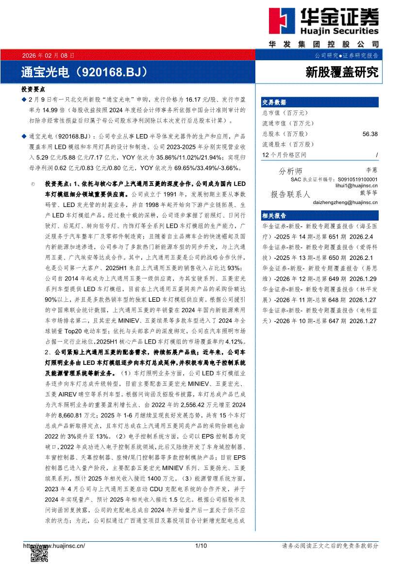 通宝光电:华金证券-通宝光电-920168-新股覆盖研究-260208