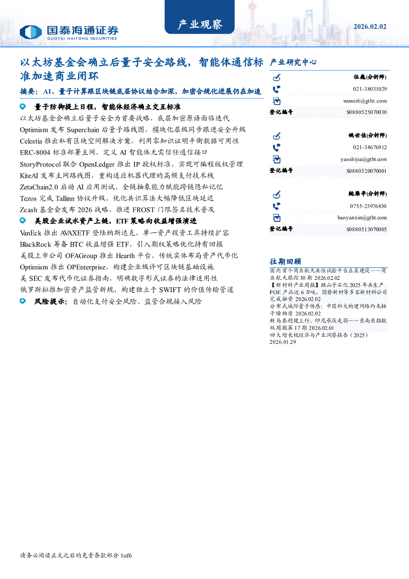 国泰海通证券-产业观察:以太坊基金会确立后量子安全路线,智能体通信标准加速商业闭环-260202