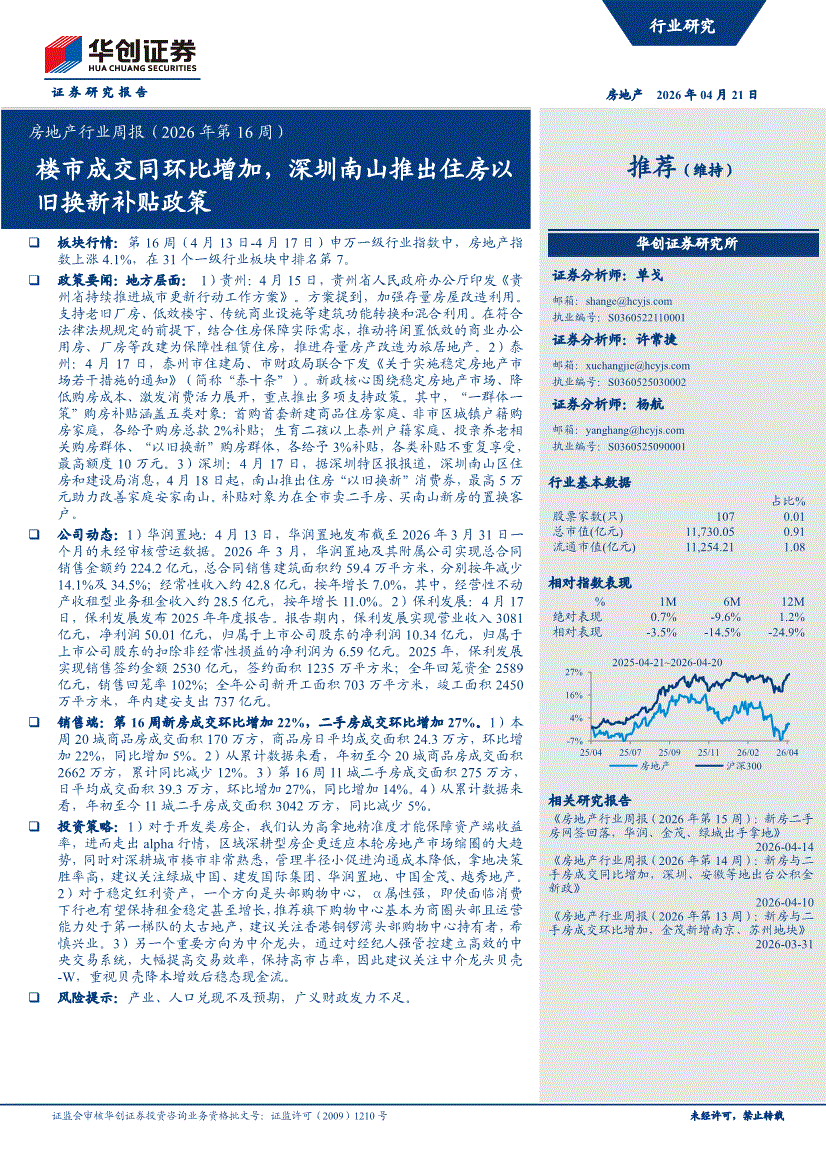 房地产行业:华创证券-房地产行业周报(2026年第16周):楼市成交同环比增加,深圳南山推出住房以旧换新补贴政策-260421