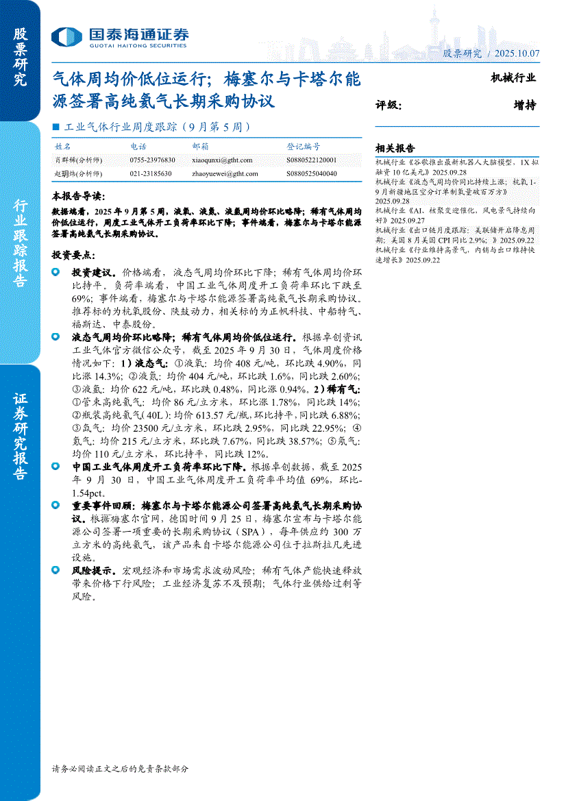 工业气体行业:国泰海通证券-工业气体行业周度跟踪(9月第5周):气体周均价低位运行;梅塞尔与卡塔尔能源签署高纯氦气长期采购协议-251007