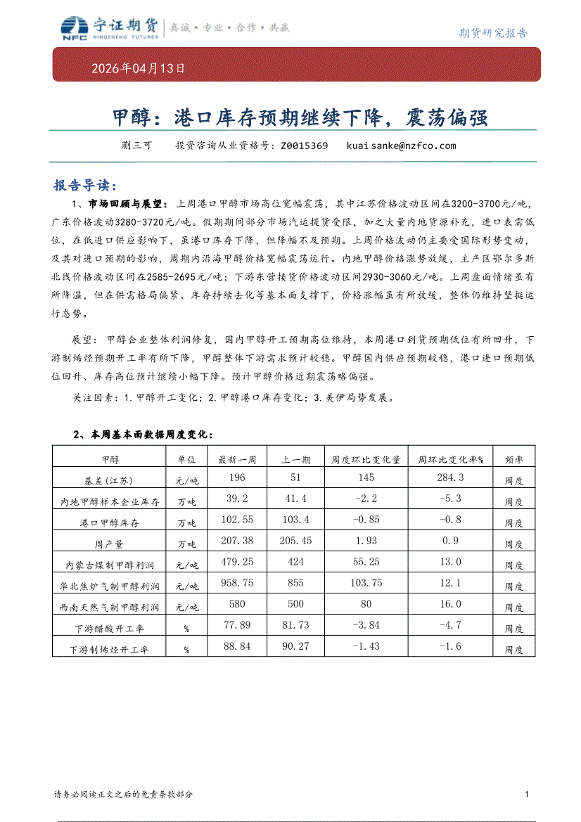 宁证期货-甲醇:港口库存预期继续下降,震荡偏强-260413