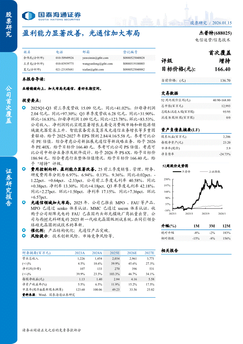 国泰海通证券-杰普特-688025-盈利能力显著改善,光通信加大布局-260115