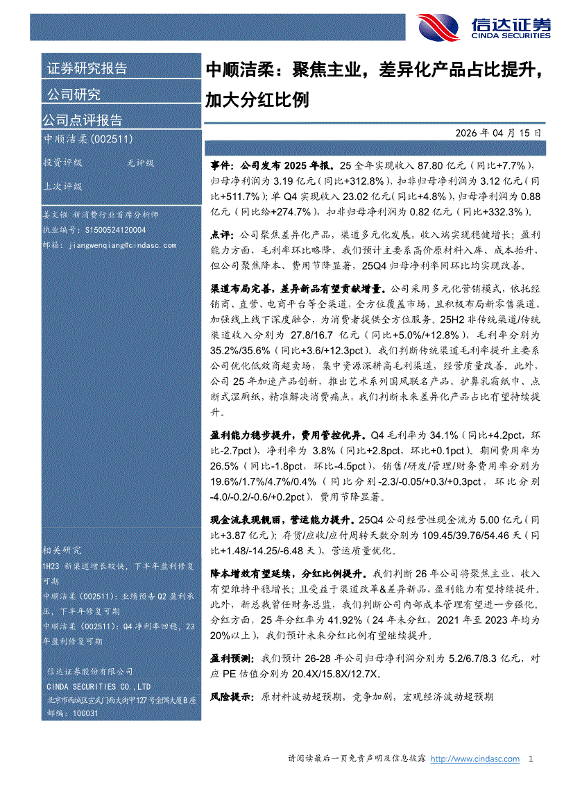 中顺洁柔:信达证券-中顺洁柔-002511-聚焦主业,差异化产品占比提升,加大分红比例-260415