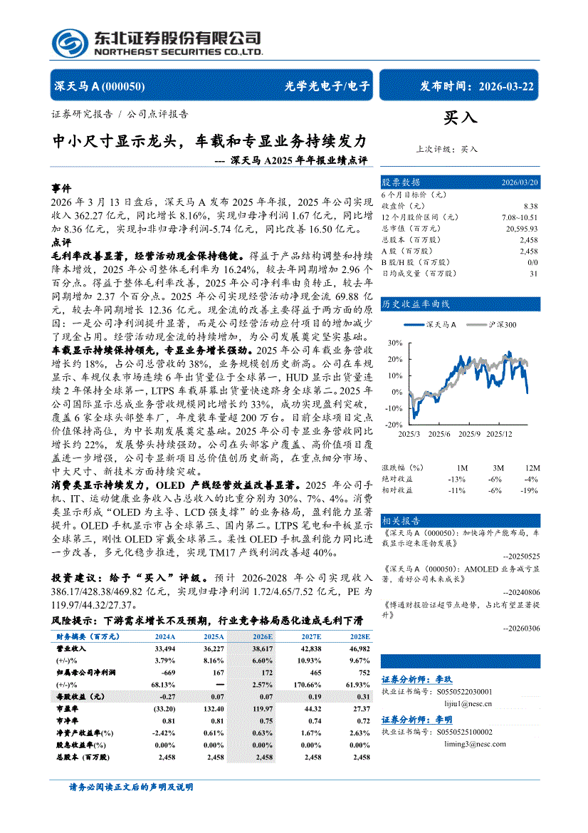 深天马A:东北证券-深天马A-000050-2025年年报业绩点评:中小尺寸显示龙头,车载和专显业务持续发力-260322