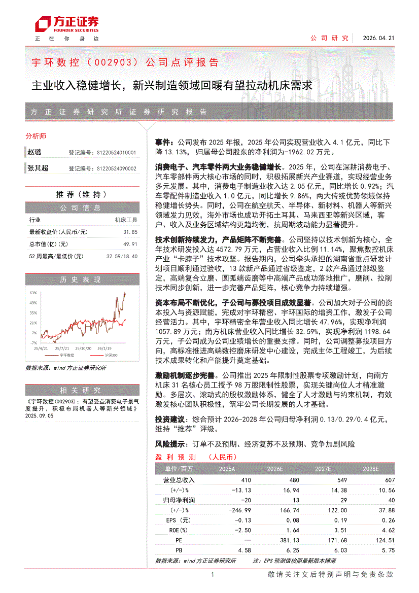宇环数控:方正证券-宇环数控-002903-公司点评报告:主业收入稳健增长,新兴制造领域回暖有望拉动机床需求-260421