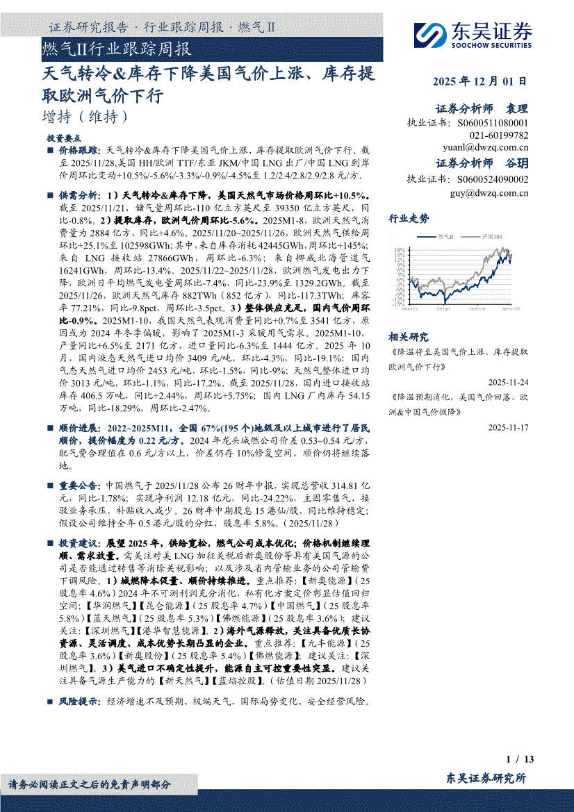 东吴证券-燃气Ⅱ行业跟踪周报:降温持续美国气价上涨、库存提取欧洲气价下行-251208