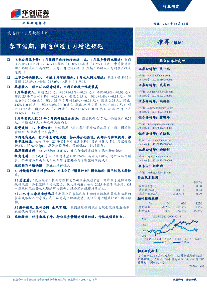 快递行业:华创证券-快递行业1月数据点评:春节错期,圆通申通1月增速领跑-260214